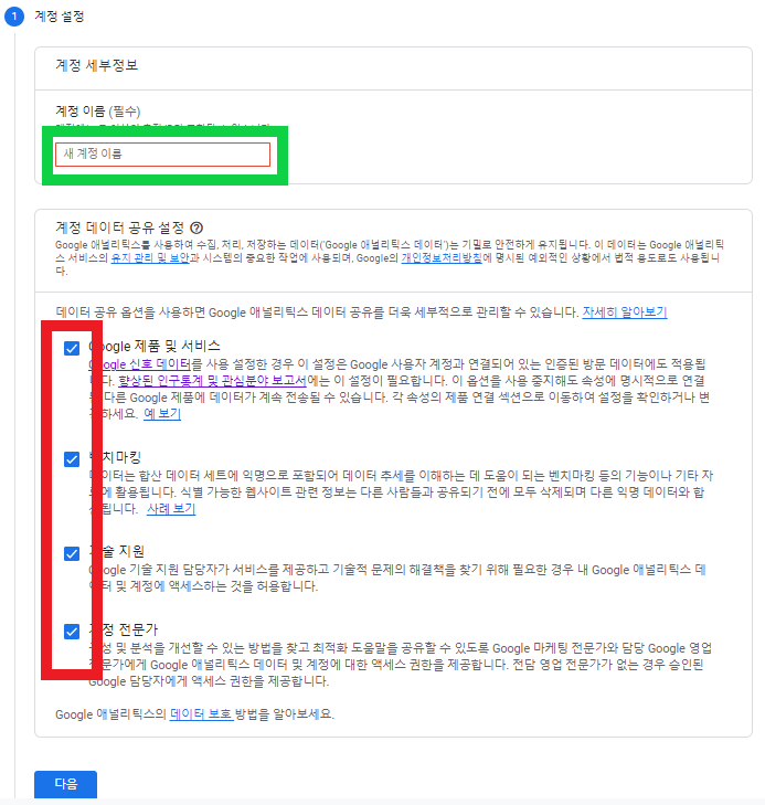 4. 계정 데이터 공유설정 항목을 체크합니다. (계정 데이터 공유설정 항목은 선택 사항 입니다.)