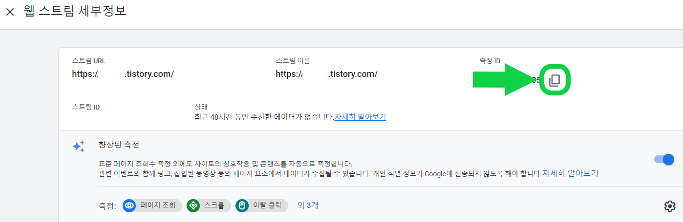 8. 웹 스트림 세부정보 화면이 나오면 측정 ID 항목에 복사하기 버튼을 클릭합니다.