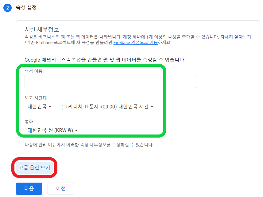 5. 속성 설정 단계에서 속성 이름을 입력한 후, 보고 시간대와 통화를 대한민국으로 선택합니다. 그리고 고급 옵션 보기를 클릭합니다.